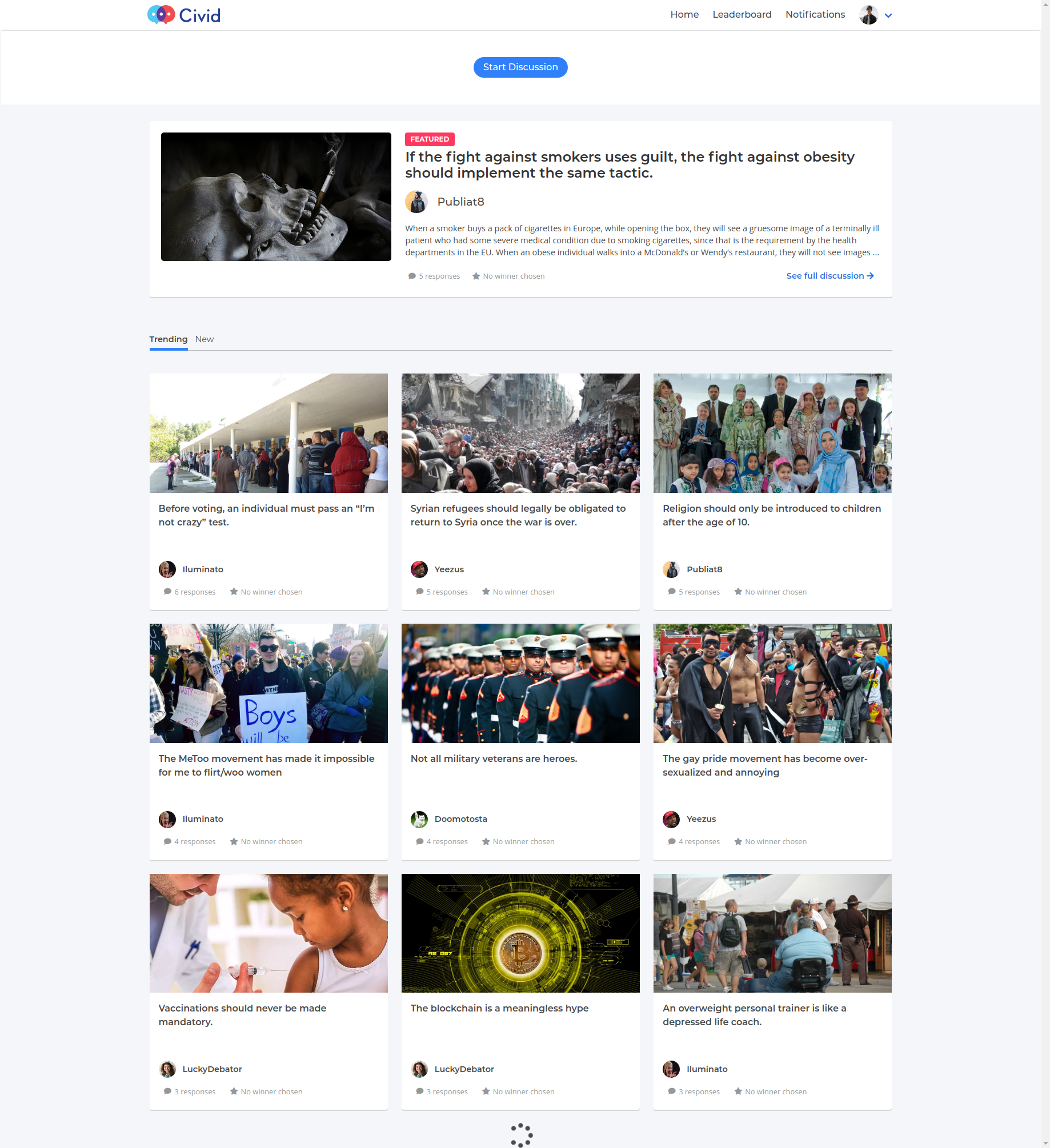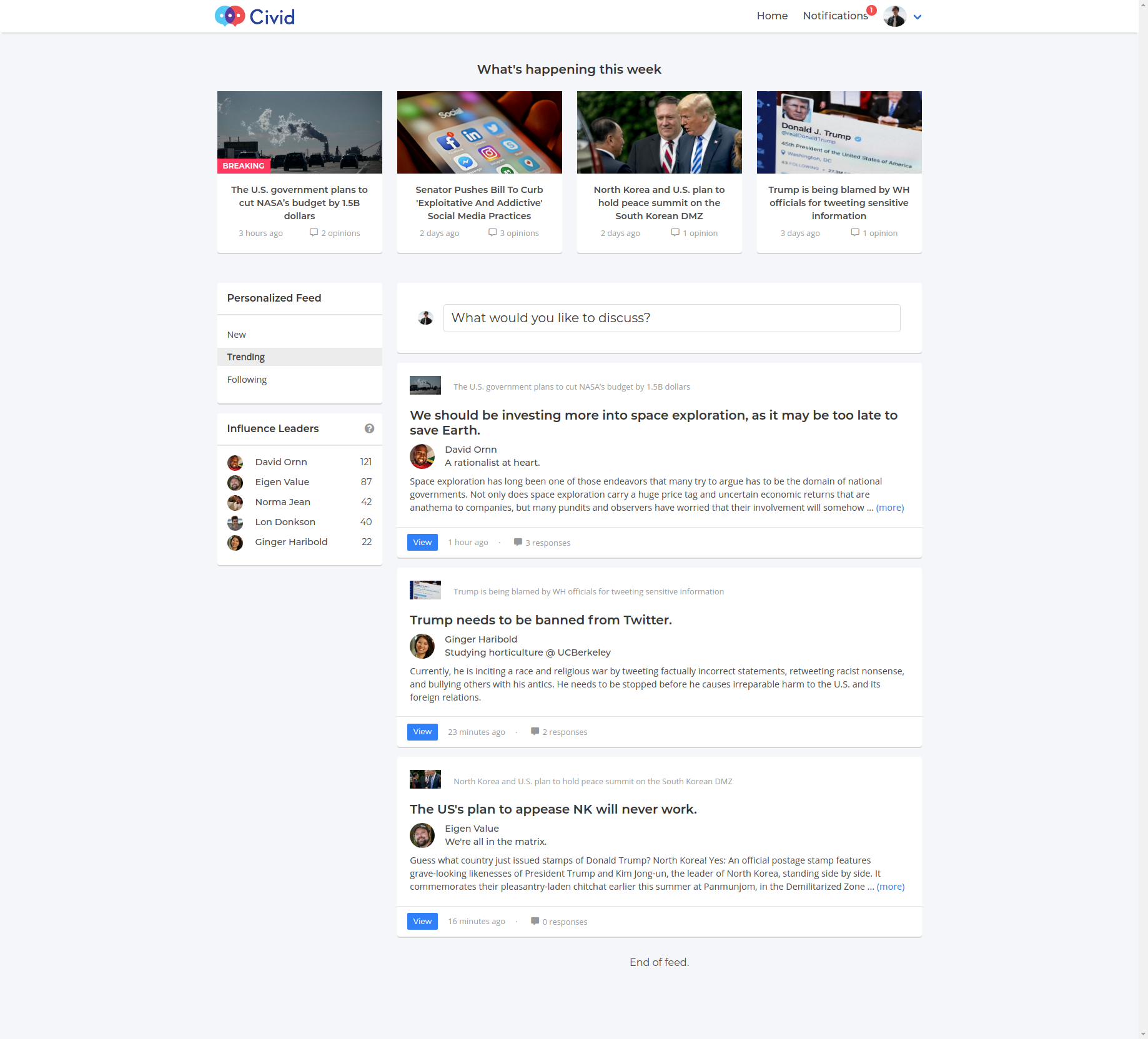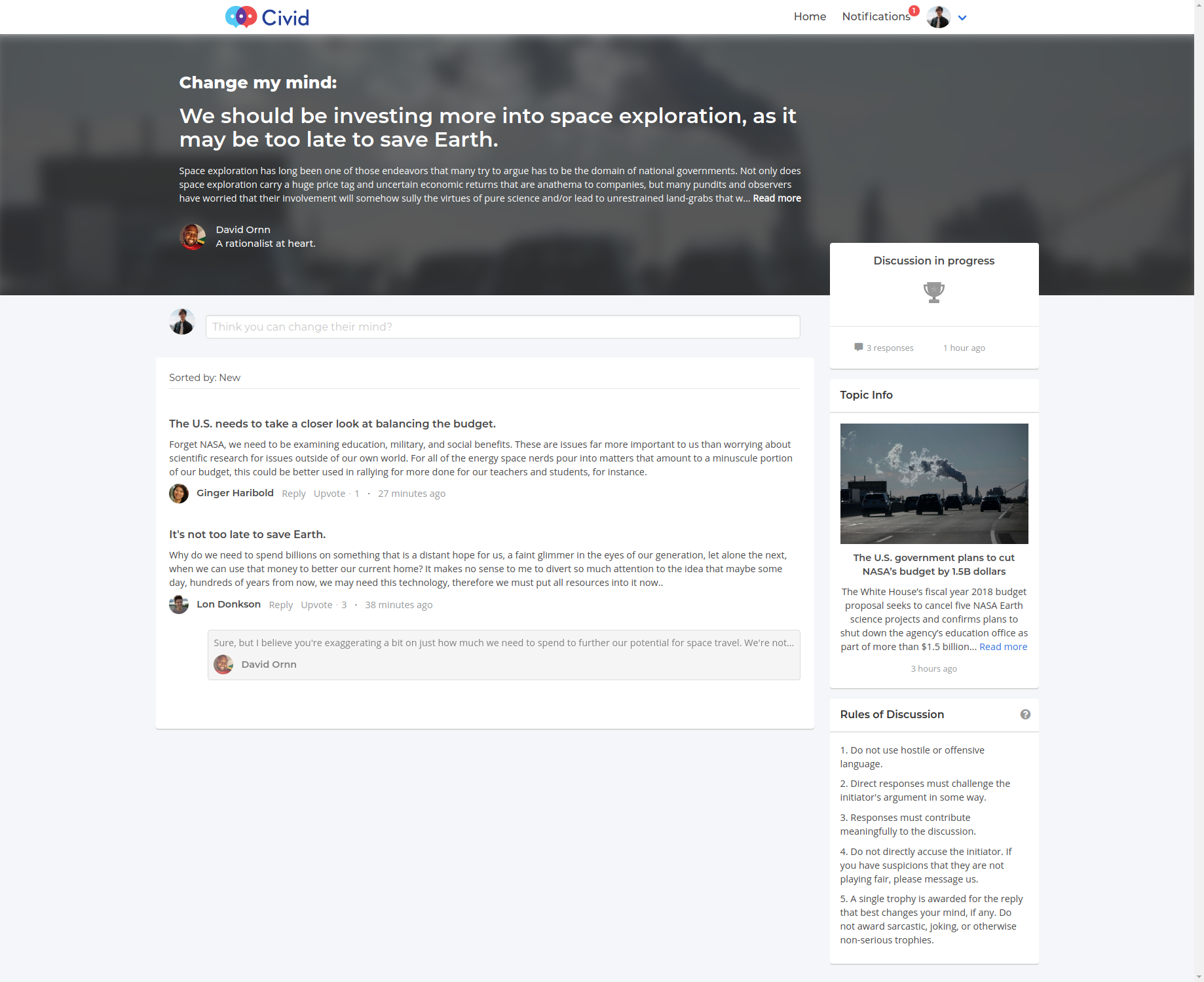 Civid was a social debate platform that revolves around the latest breaking news. Users were invited to challenge their stance on breaking news and recent events, and present new perspectives to people who want their opinions challenged.