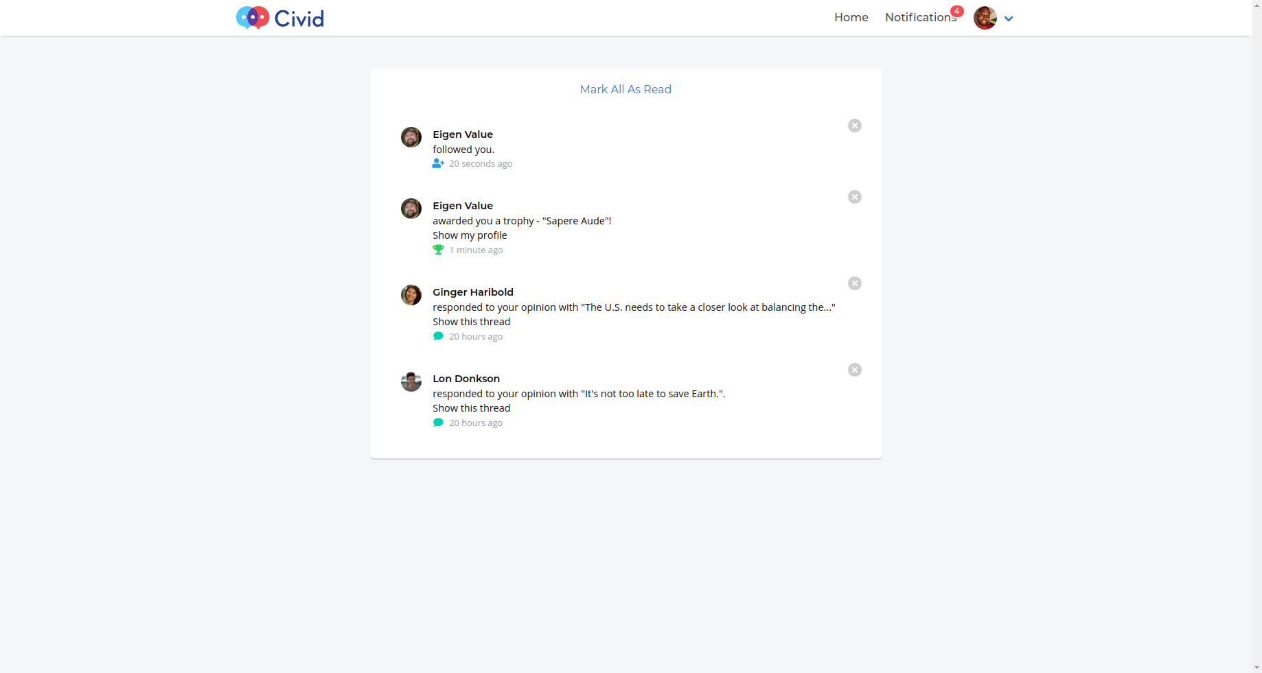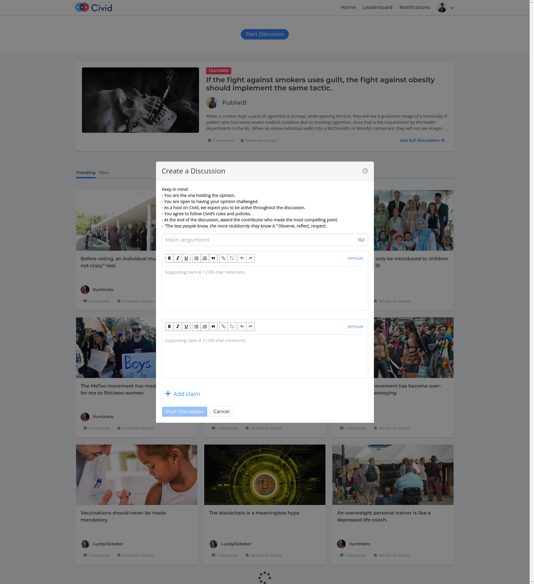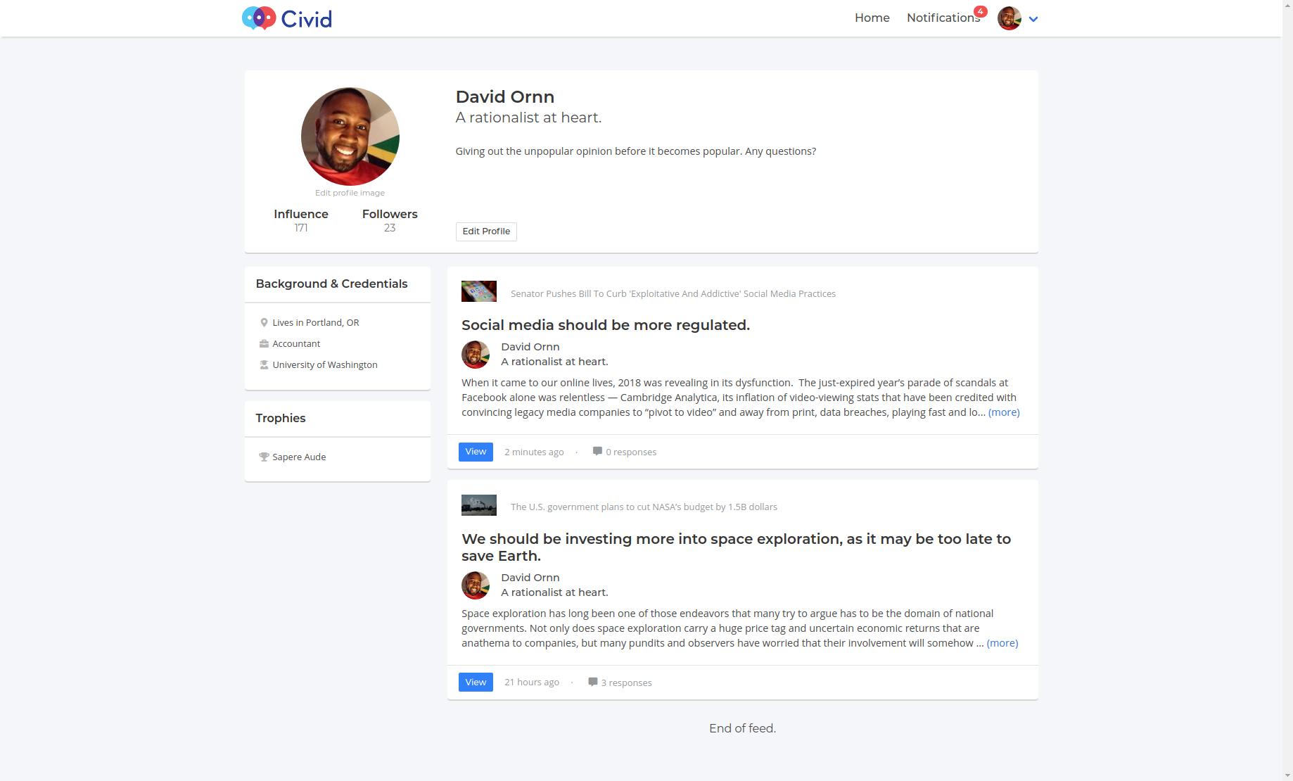 Civid was a social debate platform that revolves around the latest breaking news. Users were invited to challenge their stance on breaking news and recent events, and present new perspectives to people who want their opinions challenged.